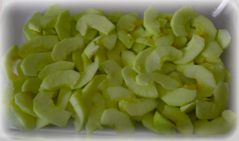 Place the sliced apples on bottom of pan. Â You don’t have to make them all lay