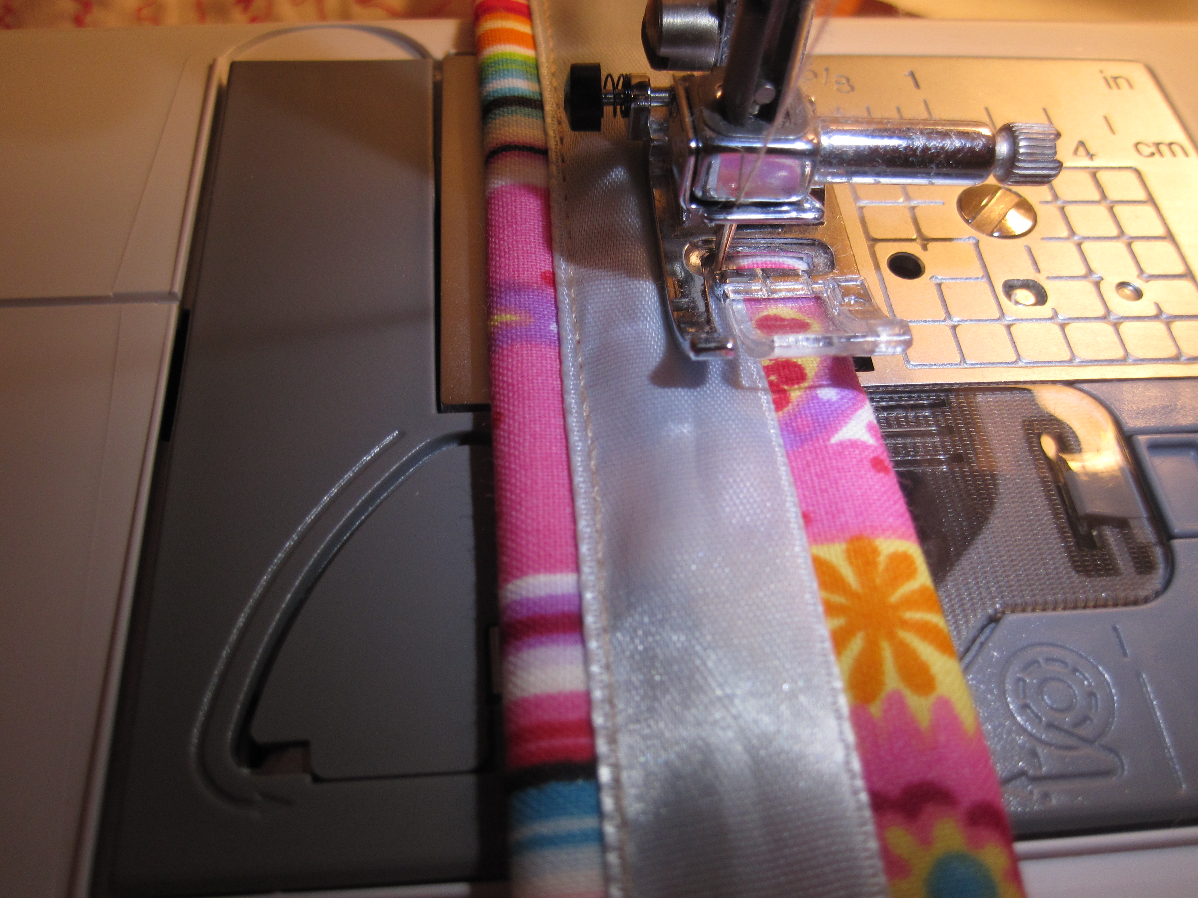 Then I sewed the satin ribbon as close to the edge of the ribbon as possible…