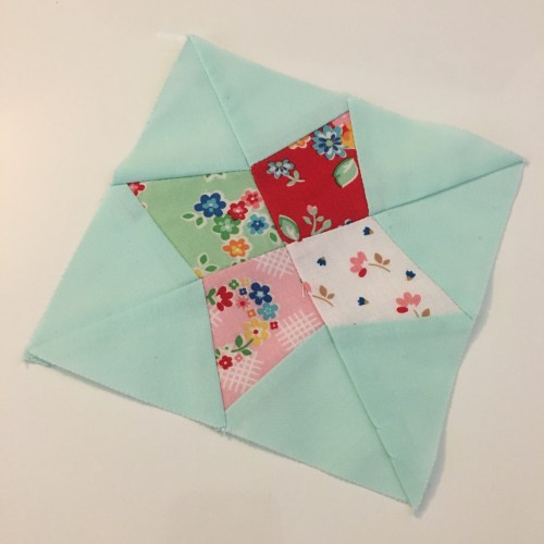 I make half-square triangles by placing two 5” squares, right sides together, and sewing all the way around the square (with a quarter-inch seam). Then I iron it, and cut across in an X (corner to corner). You’ll have four half-square triangles.